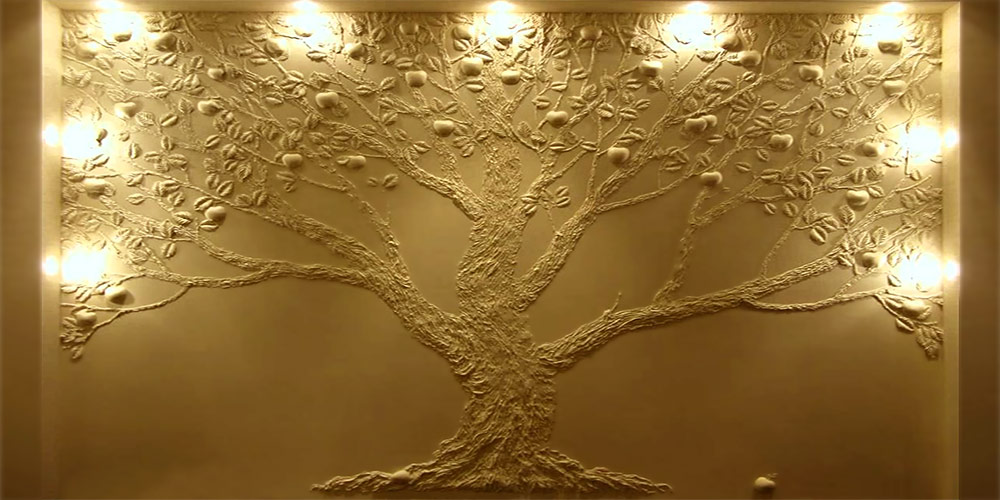 Также гипс позволяет создавать горельефные и барельефные композиции, которые могут занимать всю стену или значительную ее часть. В основе таких композиций бывают как декоративные растительные или абстрактные мотивы, так и изображения различных персонажей, сюжеты с фигурами людей или животных, и даже пейзажи!